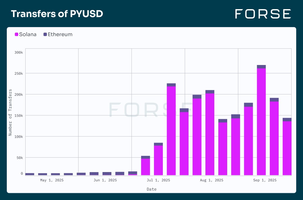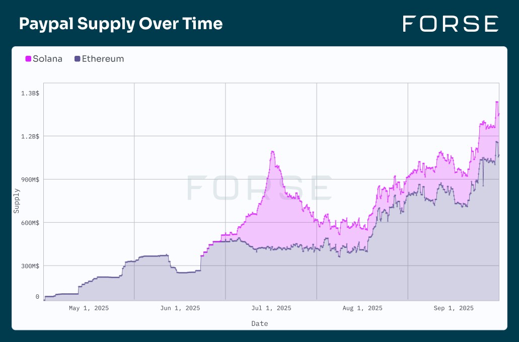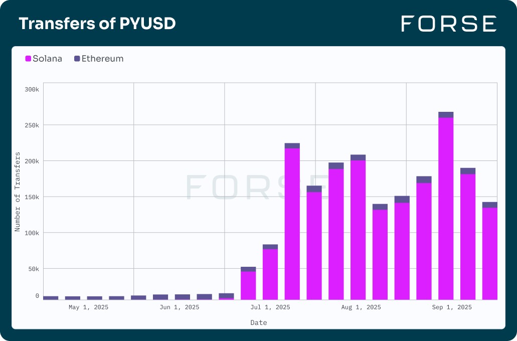 Over the same window, Ethereum kept the majority of PYUSD supply, briefly ceding market share to Solana during its 2024 ramp but stabilizing around 80% by September 2025, with Solana holding the remaining 20% as a volatile but important secondary hub.