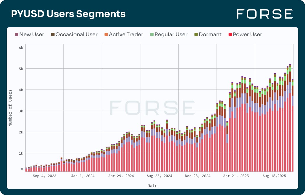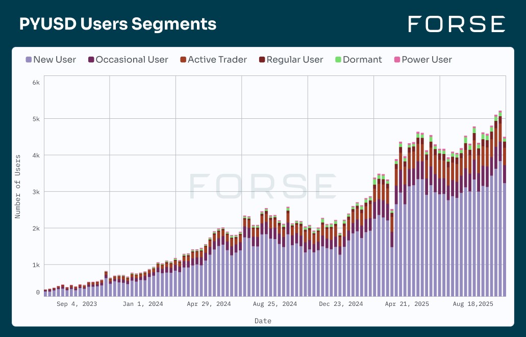 User segments group PYUSD holders into New User, Occasional User, Active Trader, Power User, Regular User, and Dormant cohorts, with internal bands like Plankton, Minnow, Dolphin, and Whale capturing balance and activity levels. This mix shows a broad base of small users under a very concentrated top of heavy, multi platform users.