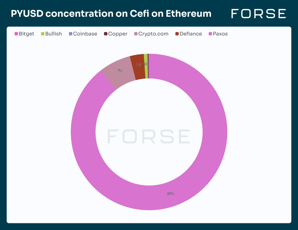 On Ethereum CeFi, most PYUSD TVL sits with Paxos Treasury, which supports the PayPal application. In practice this means the issuer controls the majority of PYUSD supply, while onchain markets and DeFi venues work with a smaller circulating float.